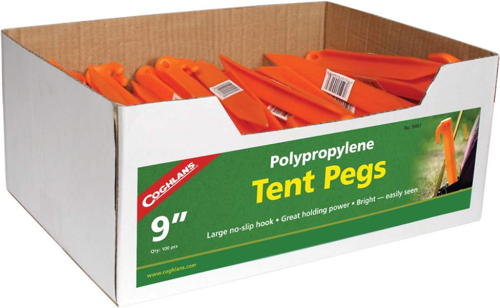 9" (23cm) plastic tent pegs made from durable polypropylene. These ruggedly designed tent stakes are bright and easily seen and feature a large no-slip hook. Comes in bulk lots of 100 pegs or carded packets of 6 pegs.