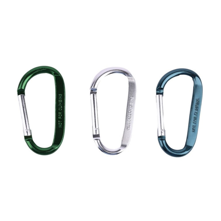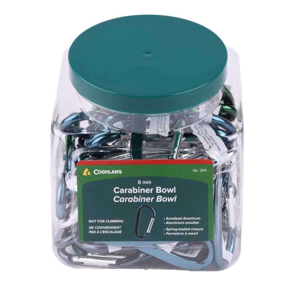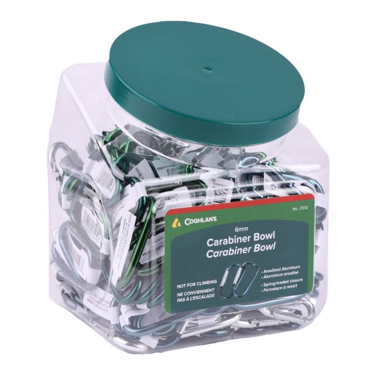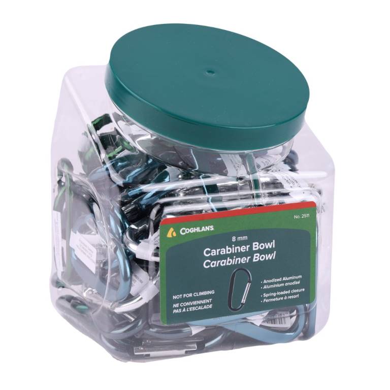 Carabiners in a shelf bowl with Coghlan's green threaded lid.