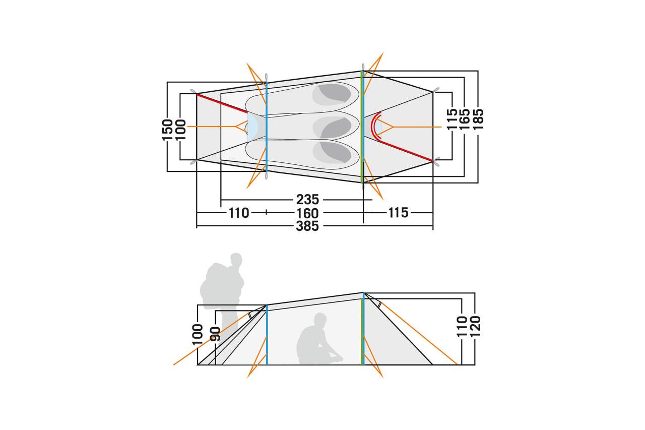 The 3-person Gargia 3 offers an exceptional space to weight ratio with an inner tent length of 2.35 m, even the tallest people can stretch out comfortably. The extra-lightweight, silicone-coated fly consists of 5-ply silicone-coated ripstop nylon 6.6 with 20-denier fiber thickness and lightweight nylon materials for the floor and inner tent provide a perfect balance of lightweight and durable. The tent floor material is PU-coated and provides optimal protection against moisture from below with a water column of 10,000 mm.