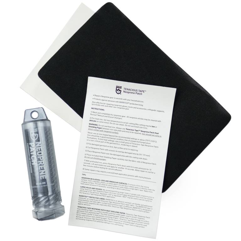 With Tenacious Tape Neoprene Patch, you can fix rips, holes and tears on anything made of neoprene. Just cut the neoprene patch to fit and use your home iron to create a permanent repair. This iron-on patch is also useful for reinforcing high-wear areas including elbows, knees and under arms. Its special lining also gives watersports gear that extra abrasion resistance. Use Tenacious Tape Neoprene patch to extend the life of your wetsuits, drysuits, waders, gloves, boots, and accessories.