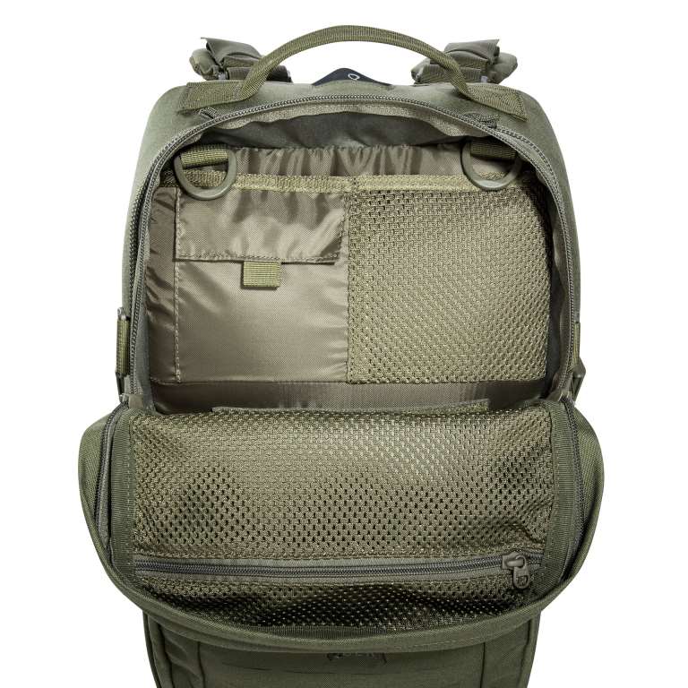 Small 22 litre universal combat backpack with two attachable pockets and elastic side pockets. It has a MOLLE hook-and-loop in the main compartment for customised modular add-ons and the laser-cut MOLLE on the front and sides mean you can combine it with other gear. With a main compartment that opens completely and the special zipper guides it’s possible to use the pack as a top loader. The shoulder straps can also be adjusted in length in order to wear the backpack over vests.
