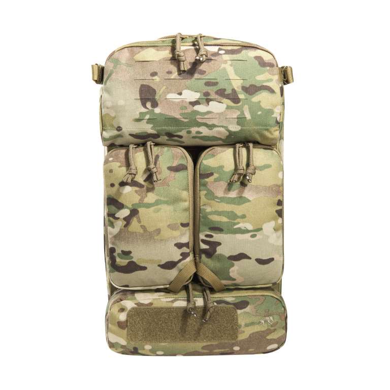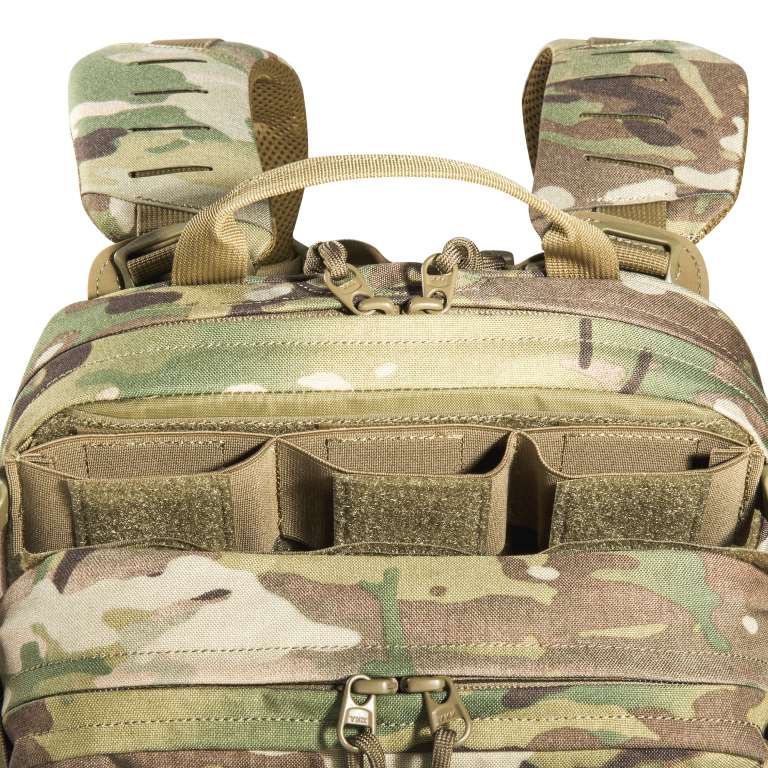 It has a flat main compartment that is hydration system compatible and the back panel is fitted with MOLLE hook-and-loop for customisable arrangement of your gear. The upper front pocket of the backpack is a flip-top, behind which you can attach a magazine holder (three magazines). Both middle front pockets are removable and behind each is a MOLLE hook-and-loop surface.