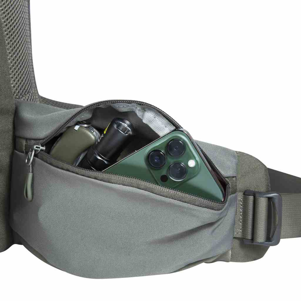 - Special construction whereby hipbelt-fixation is re-directed to allow for single-handed adjustment