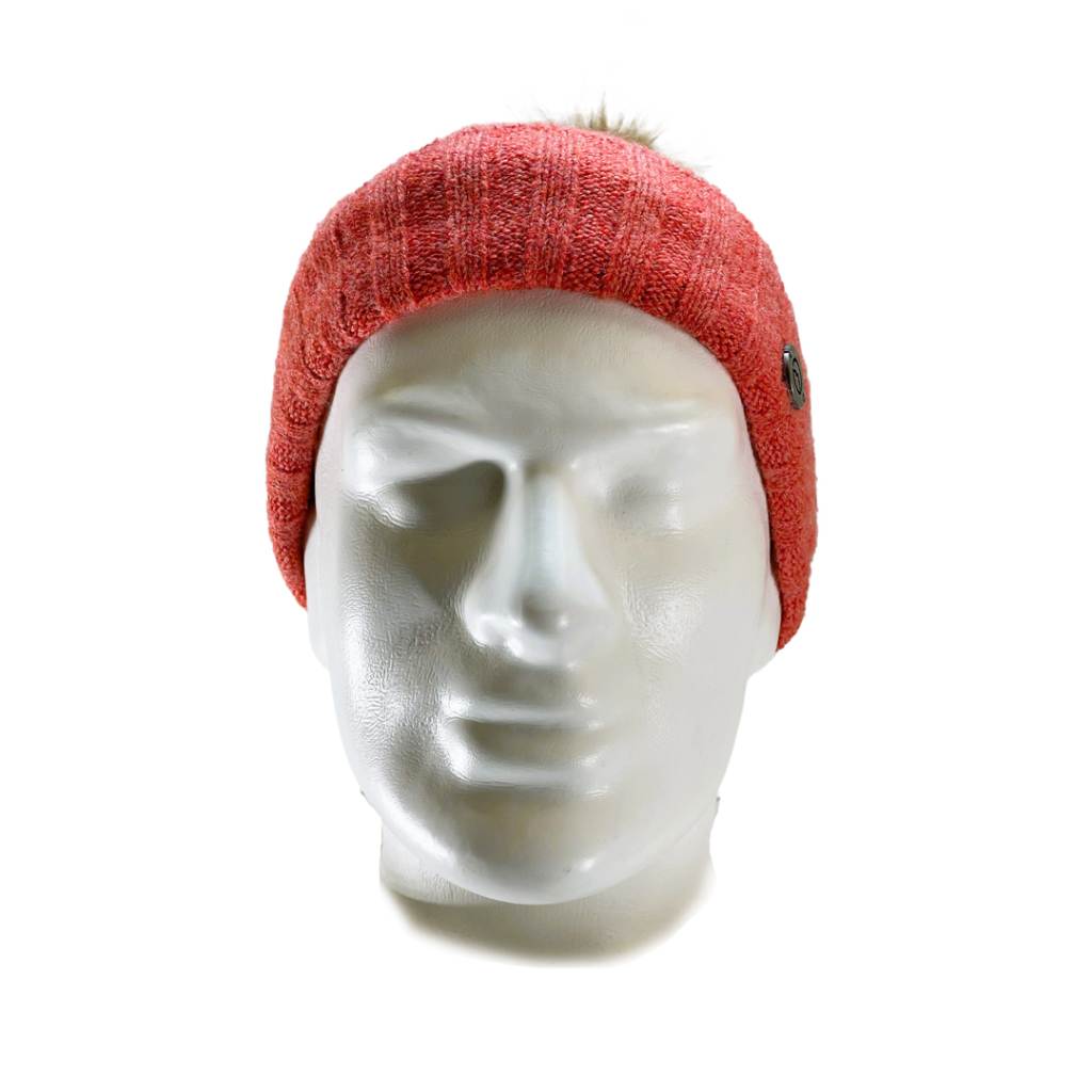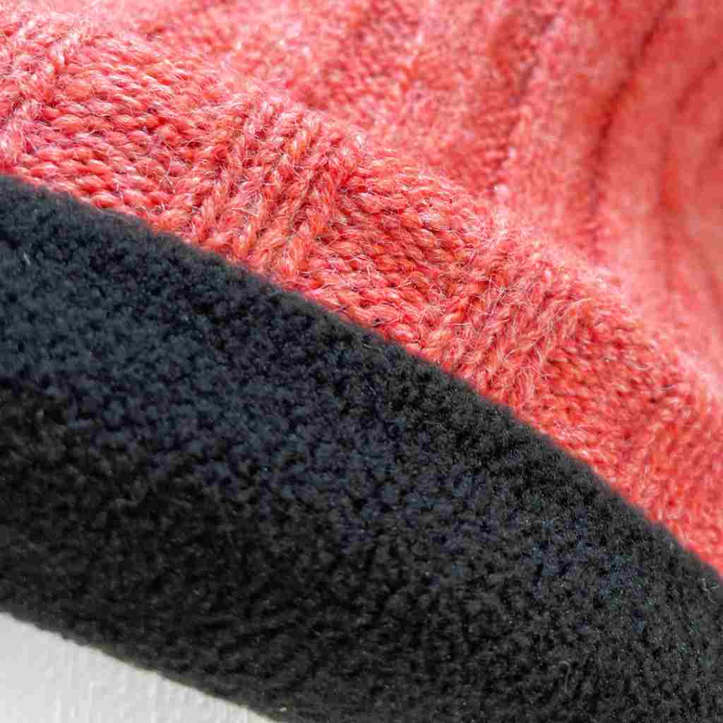 Pink thick rib-knit cuffed beanie with fluffy faux fur accent pom pom at the crown and plush polar fleece lining for greater comfort and additional warmth.