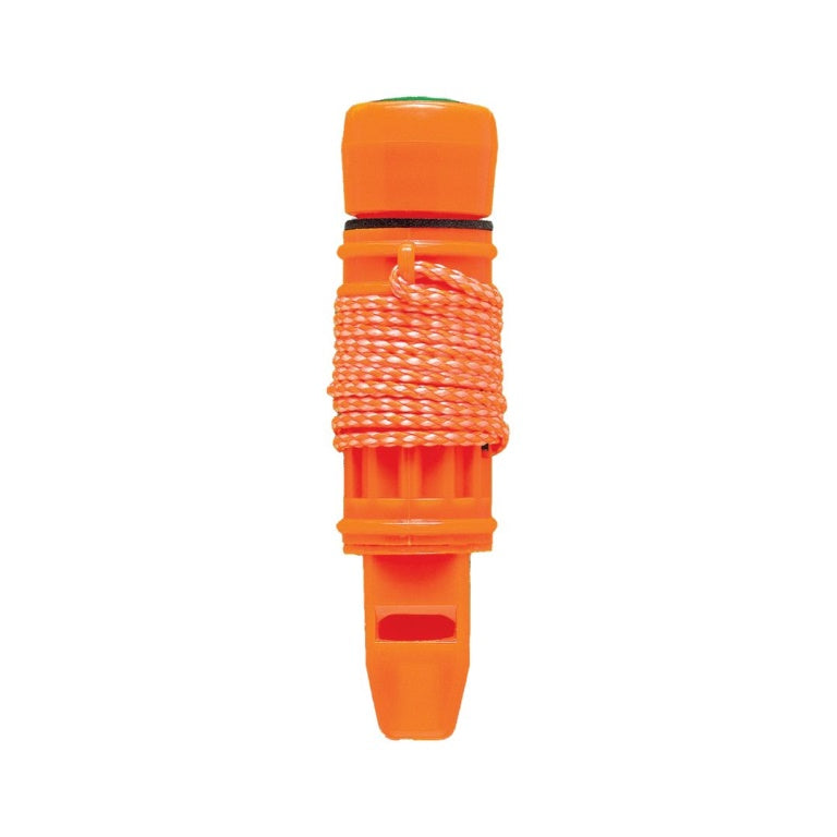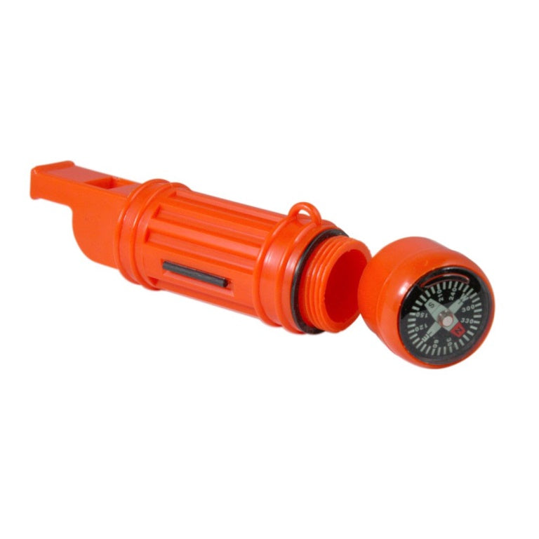 5-in-1 survival tool with a waterproof matchbox, liquid filled dial compass, fire starter flint, shrill signal whistle and nylon lanyard.
